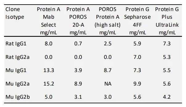 Primarily at issue is that rodent antibodies bind poorly to Protein A [1,2], although somewhat better on recombinant Protein A than on natural Protein A. Protein A can be utilized to purify most rat and mouse species isoforms. The common capacity of recombinant Protein A for mouse and rat antibody is greater than 5 mg/mL with a few exceptions. Binding in a condition comprised of 0.75 M Glycine, 1.5 M NaCl, pH 8.9 condition can enhance the binding capacity for difficult clones as described by Shuler [3] and Bazin [4]. Most rodent antibody isotypes will bind strongly to Protein G; however, the capacities observed are similar to the capacity on Protein A with enhanced binding high salt pH 8.9. One exception is rat IgG2a which will not bind to Protein A. Protein G binding of our rodent antibody protein is approximately 5 mg/mL resin (Table 1). The benefit of Protein G is that the product is clarified in one purification step. The drawback includes the high cost of Protein G Sepharose, -especially in scaling the purification to 10 to 100 grams of protein which may be required for some studies. Also, the yield is low without using strong acidity which may denature the protein. In addition, we have found our columns may only be reused a limited number of times due to weak tolerance to the more stringent cleaning solutions [5].