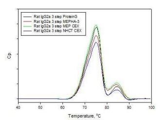 Fig. 5. DSC profiles of rat IgG2a antibody products purified from serum free hybridoma media captured on Protein G, 4-MEP, or Capto MMC, followed by CEX or HA and formulated into PBS on gel filtration chromatography.