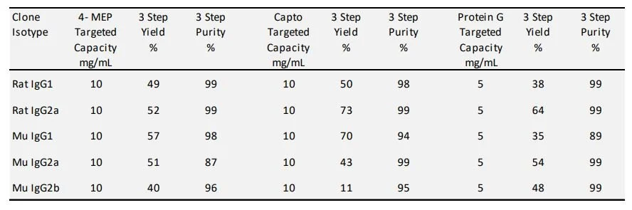 Table 3. Three step purification of hybridoma production media on 4-MEP, Capto MMC and Protein G coupled resin.