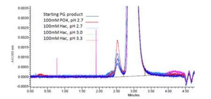 Fig. 2. Denaturation-induced aggregates from the Protein G elution step by UPLC Analytical SEC Assay. The amount of aggregation increases with low pH and increased acid strength.