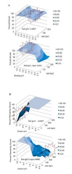 Fig. 4. A) Binding and elution profiles for rat IgG1 from 96 well filter plate study. Purified rodent antibody was bound to 4-MEP or Capto MMC beads at 250 ug Ab per 50uL resin. A) Binding conditions in 25 mM buffer from pH 5.0 to 8.5 in 0 - 250 mM NaCl. B) Elution conditions binding Mab onto 4-MEP in 25 mM K3PO4, pH 7.5 or 25 mM MES pH 6.0 onto Capto MMC. Buffer pH was varied from 3.5 to 7.0 on 4-MEP and pH 5.0 to 8.5 and 0 to 800 mM NaCl for Capto MMC.